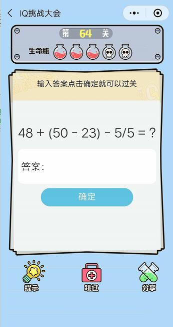 微信IQ挑戰(zhàn)大會第64關(guān)【輸入答案點擊確定就可以過關(guān)】答案攻略 ... [更多詳細]