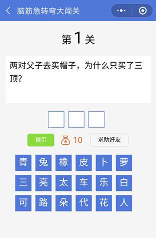 微信腦筋急轉彎大闖關第1關【兩對父子去買帽子為什么只買了三頂】答案攻略 ... [更多詳細]