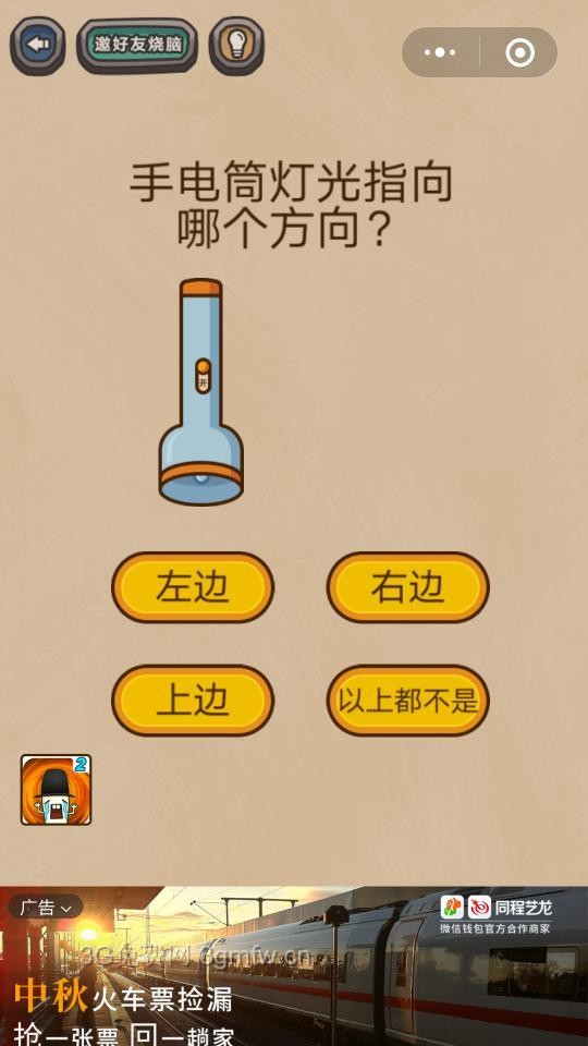 微信最燒腦游戲劈腿2第9關【手電筒燈光指向哪個方向】答案攻略 ... [更多詳細]