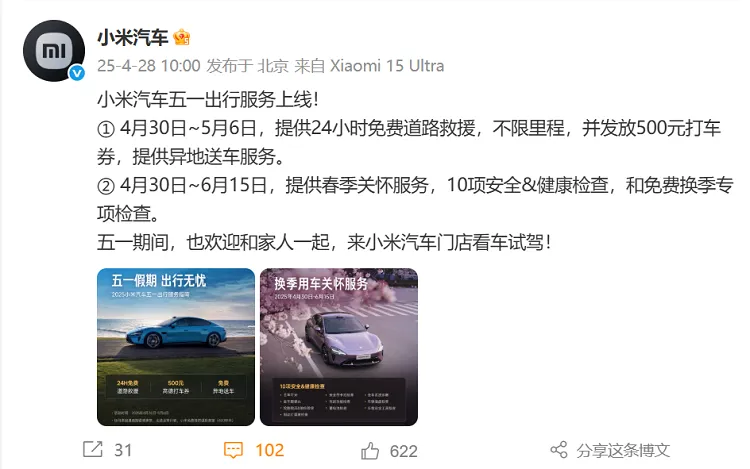 小米汽車五一期間提供免費(fèi)道路救援