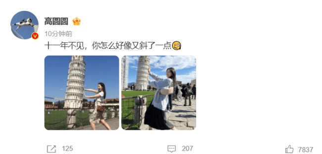 高圓圓時隔11年再打卡比薩斜塔:十一年不見,你怎么好像又斜了一點 ... [更多詳細]