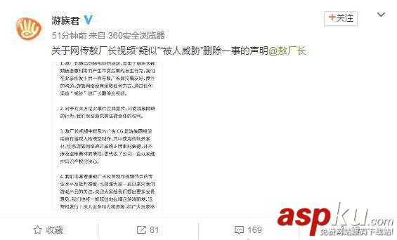 敖廠長刪視頻事件續 游族:沒采取任何方式“威脅” ... [更多詳細]