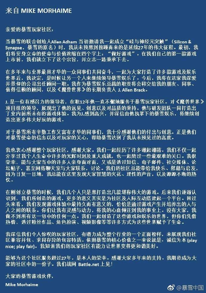 本周三,暴雪官方宣布,Mike Morhaime將卸去暴雪娛樂總裁職位,并出任公司顧問一職;J.Allen Brack將接替Mike成為新 ... [更多詳細]