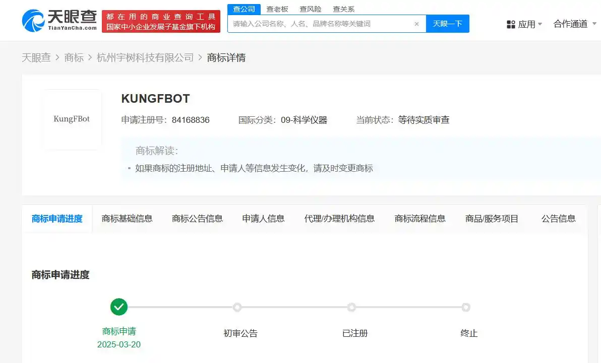 宇樹科技申請注冊功夫機器人商標“KungFBot” ... [更多詳細]