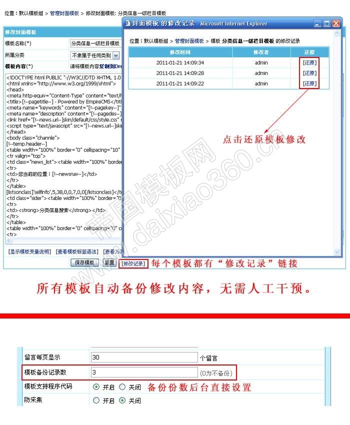 帝國cms6.6版本新增模板自動備份功能,可隨時還原備份 ... [更多詳細]