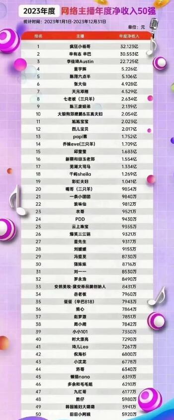 2023年主播凈收入50強公布:瘋狂小楊哥年收入32.123億 ... [更多詳細]