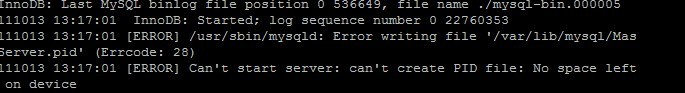 mysql:Can't start server: can't create PID file: No space left on device ... [更多詳細]