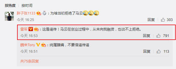 隨后,有網友在微博跟帖詢問為何當年要拒絕(投資)馬云,對此雷軍表示:“這是謠傳!馬云在創業過程中,從未向我融資,也談不上拒絕?!?br/>