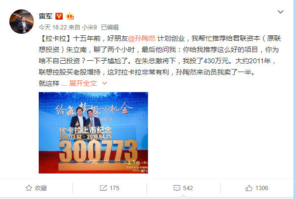 上述發言是雷軍回憶拉卡拉上市時提到的。他在微博上稱,十五年前好朋友@孫陶然計劃創業,其幫忙推薦給君聯資本(原聯想投資)朱立南,聊了兩個小時后,最終幫朋友融資幫成了股東。雷軍直言自己運氣太好了(當年25萬投拉卡拉現在上市后回報2.25億元,狂賺900倍。),第一個天使投資的項目拉卡拉,經過了長達十四年的各種坎坷,4月25日成功上市,終成正果。