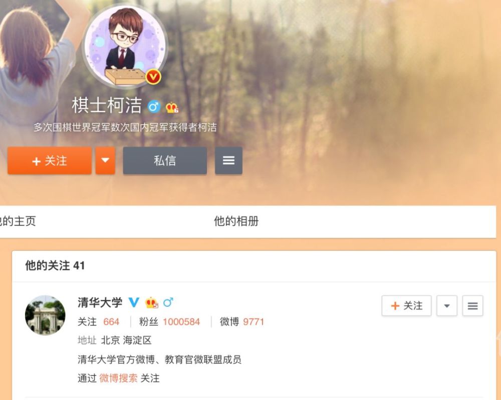 長安街知事注意到,柯潔的微博近期已關注了清華大學,如果順利通過公示,他將于今年下半年赴清華園報到。