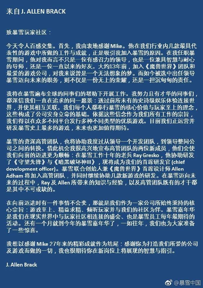 新總裁J.Allen Brack在信中講到:“目前我們正運營并研發暴雪史上最多的游戲,未來也更加值得期待。”