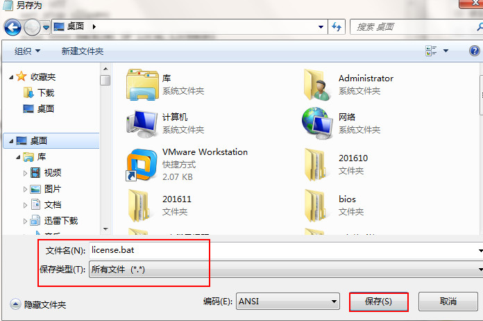 3、將保存類型改為所有文件,文件名改為license.bat,點(diǎn)擊保存即可,如下圖所示: