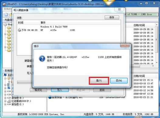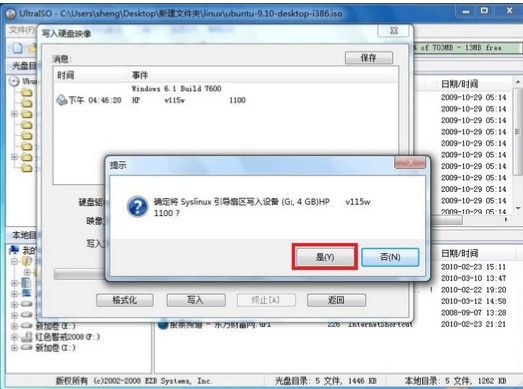點擊了“寫入”按鈕以后將會彈出一個確定窗口,其表達的意思是讓您進一步確認是否將iso鏡像包寫入到該u盤里面,我們只要點擊“是(Y)”按鈕即可,如下圖: