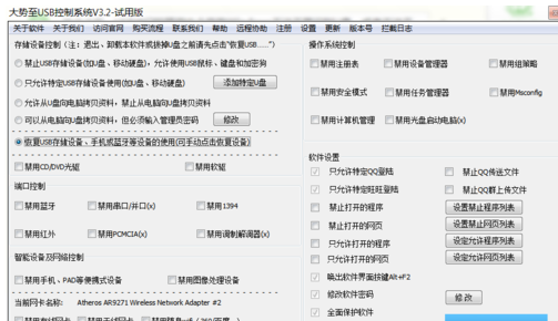 安裝并運行此工具后,按鍵盤組合鍵“Alt+F2”即可喚醒程序主界面,勾選“恢復USB存儲設備、手機或藍牙等設備的使用”項,此時電腦USB接口可正常使用。