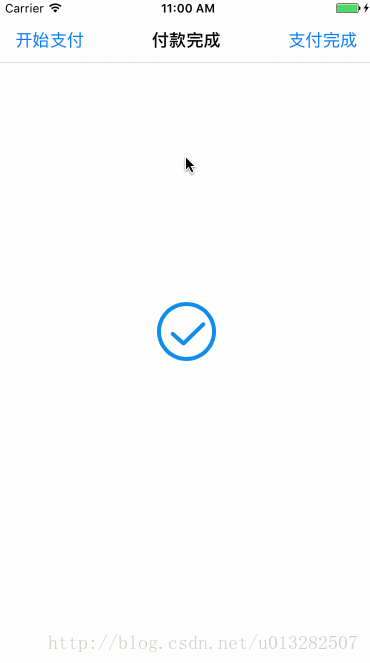 -(void)updateAnimationLayer{ _startAngle = -M_PI_2; _endAngle = -M_PI_2 +_progress * M_PI * 2; if (_endAngle > M_PI) { CGFloat progress1 = 1 - (1 - _progress)/0.25; _startAngle = -M_PI_2 + progress1 * M_PI * 2; } CGFloat radius = _animationLayer.bounds.size.width/2.0f - lineWidth/2.0f; CGFloat centerX = _animationLayer.bounds.size.width/2.0f; CGFloat centerY = _animationLayer.bounds.size.height/2.0f; UIBezierPath *path = [UIBezierPath bezierPathWithArcCenter:CGPointMake(centerX, centerY) radius:radius startAngle:_startAngle endAngle:_endAngle clockwise:true]; path.lineCapStyle = kCGLineCapRound; _animationLayer.path = path.CGPath;}支付完成動(dòng)畫解析