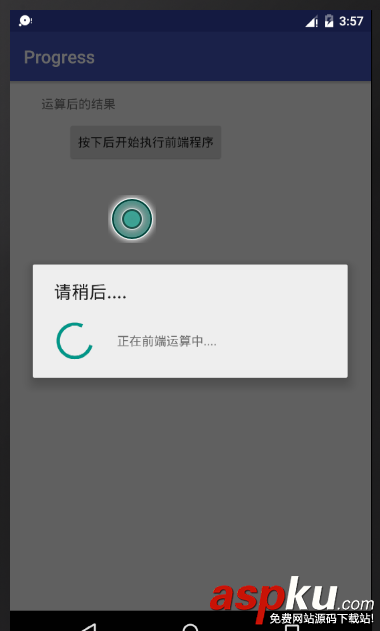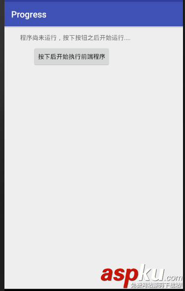 public class MainActivity extends AppCompatActivity { private Button bt; private TextView tv; public ProgressDialog myDialog; @Override protected void onCreate(Bundle savedInstanceState) { super.onCreate(savedInstanceState); setContentView(R.layout.activity_main); bt=(Button)findViewById(R.id.button); tv=(TextView)findViewById(R.id.text); bt.setOnClickListener(new myOnClickListener()); } private class myOnClickListener implements View.OnClickListener{ @Override public void onClick(View v) { final CharSequence strDialogTitle=getString(R.string.app_about); final CharSequence strDialogBody=getString(R.string.app_msg); //顯示對話框 myDialog=ProgressDialog.show(MainActivity.this,strDialogTitle,strDialogBody,true); tv.setText(R.string.result); //創建一個空線程模擬運行 new Thread(){ public void run(){ try{ //設置線程睡眠3秒 sleep(3000); }catch (Exception e){ e.printStackTrace(); } finally { //刪除所創建的myDialog對象 myDialog.dismiss(); } } }.start();//開始運行線程 } }}以上就是本文的全部內容,希望對大家的學習有所幫助,也希望大家多多支持VEVB武林網。
