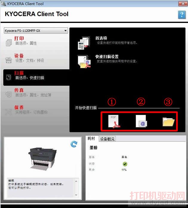 2、打開“KYOCERA Client Tool”后在頁面中間可以看到開始快速掃描,根據(jù)需求可以選擇不同的掃描方案