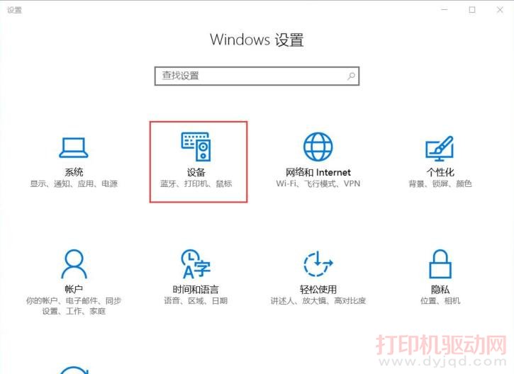 2、在Windows設(shè)置窗窗口中找到“設(shè)備”項(xiàng)并點(diǎn)擊(此項(xiàng)包含了藍(lán)牙,打印機(jī),鼠標(biāo)的設(shè)置);