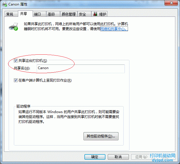3. 切換到【共享】選項卡,勾選【共享這臺打印機】,并且設置一個共享名(請記住該共享名,后面的設置可能會用到),如下圖: