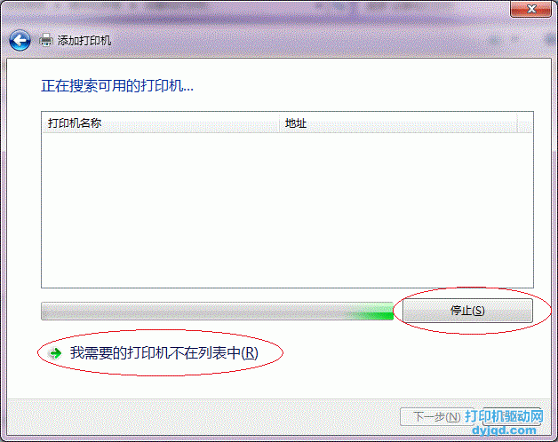 如果你沒有什么耐性的話,可以直接點擊【停止】,然后點擊【我需要的打印機不在列表中】,接著點擊【下一步】,如下圖: