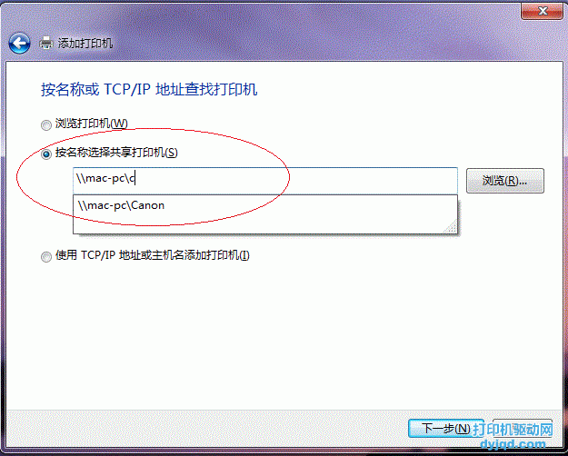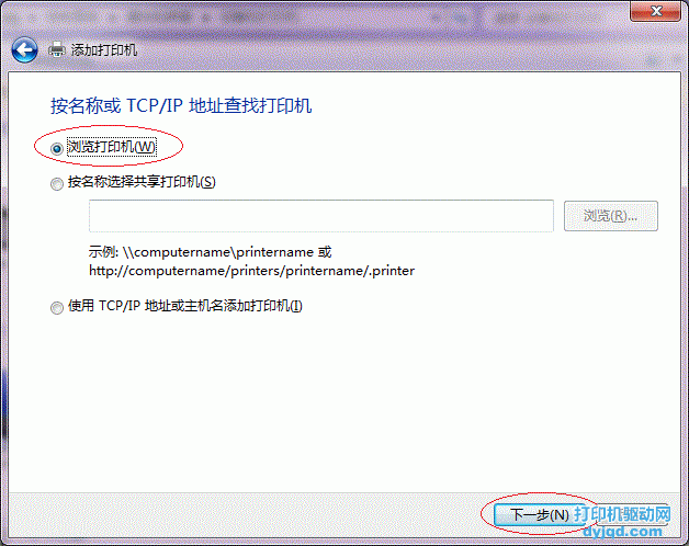 1. 選擇【瀏覽打印機】,點擊【下一步】,如下圖: