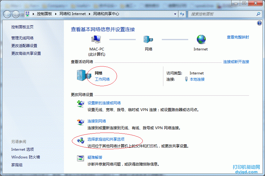 2. 記住所處的網絡類型(這里選 工作網絡 或 家庭網絡 公用網絡是共享不了的),接著在彈出中窗口中單擊【選擇家庭組和共享選項】,如下圖: