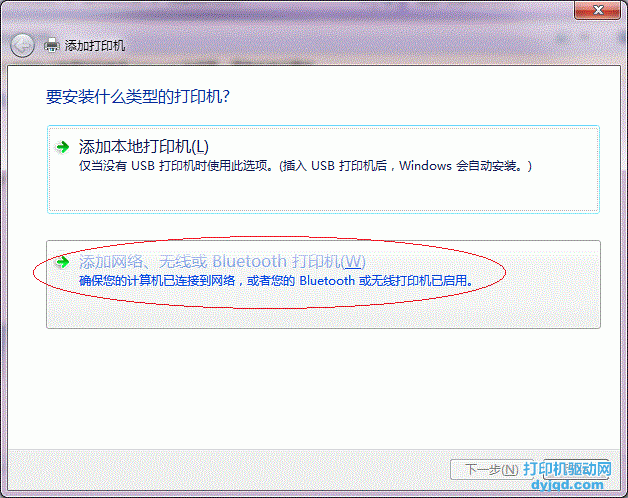 接下來,選擇【添加網絡、無線或Bluetooth打印機】,點擊【下一步】,如下圖: