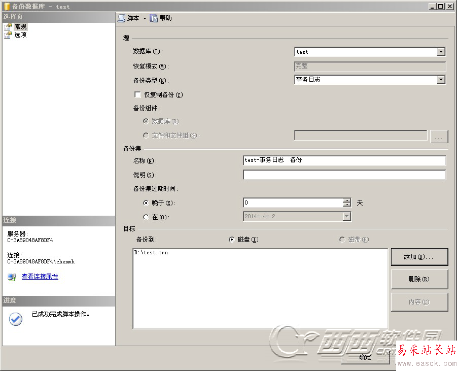 BACKUP LOG [test] TO DISK = N'D:/test.trn' WITH NOFORMAT, INIT, NAME = N'test-事務日志 備份', SKIP, NOREWIND, NOUNLOAD, STATS = 10GO
