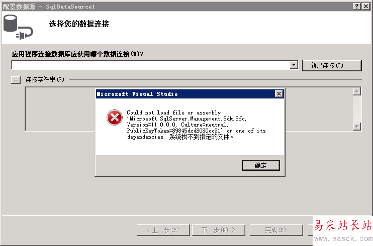 在vs2013里利用向導SqlDataSource配置數(shù)據(jù)庫連接時,點擊測試連接提示成功,當點擊確定時報錯: