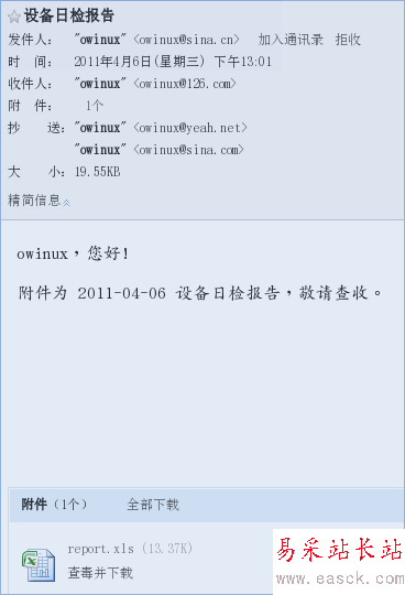 cat mailcontent | /usr/bin/mutt -s "設(shè)備日檢報(bào)告" -a /root/owinux/report.xls owinux@126.com -c owinux@yeah.net -c owinux@sina.com