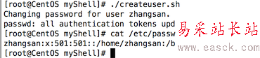 USER_COUNT=`cat /etc/passwd | grep '^zhangsan:' -c`USER_NAME='zhangsan'if [ $USER_COUNT -ne 1 ] then useradd $USER_NAME echo "123456" | passwd $USER_NAME --stdin else echo 'user exits'fi