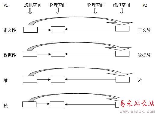 (2) 為這四個部分分配物理塊,P2的:正文段(為P1的正文段的物理塊,其實就是不為P2分配正文段塊,讓P2的正文段指向P1的正文段塊),數據段(P2自己的數據段塊,為其分配對應的塊),堆(P2自己的堆塊),棧(P2自己的棧塊)。如下圖所示,同左到右大的方向箭頭表示復制內容:
