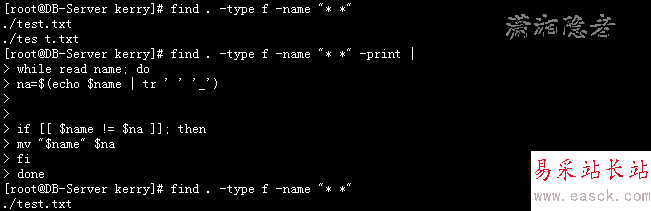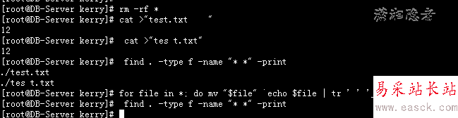 [root@DB-Server kerry]# rm -rf *[root@DB-Server kerry]# cat >"test.txt "12[root@DB-Server kerry]# cat >"tes t.txt"12[root@DB-Server kerry]# find . -type f -name "* *" -print./test.txt ./tes t.txt[root@DB-Server kerry]# for file in *; do mv "$file" `echo $file | tr ' ' '_'` ; done[root@DB-Server kerry]# find . -type f -name "* *" -print[root@DB-Server kerry]# ls -lrttotal 8-rw-r--r-- 1 root root 0 Nov 13 10:04 test.txt-rw-r--r-- 1 root root 0 Nov 13 10:04 tes_t.txt