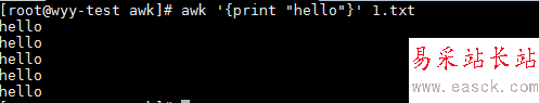 awk '{print "hello"}' 1.txt #逐行讀取1.txt文件內容,每行結束后打印一個hello,文件1.txt有多少行就打印多少個hello