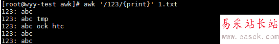 awk '/123/{print}' 1.txt #打印1.txt中匹配123的那一行內容