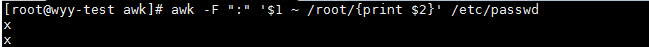 awk -F ":" '$1 ~ /root/{print $2}' /etc/passwd #打印/etc/passwd中,第一列匹配root的行其第二列的內容 ~表示匹配