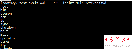 awk -F ":" '{print $1}' /etc/passwd #以":"為分隔符打印/etc/passwd文件的第一例內容