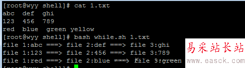 #!/bin/bashfile=$1if [[ $# -lt 1 ]]then echo "Usage: $0 please enter you filepath" exitfiwhile read -r f1 f2 f3 #將文件內容分為三列do echo "file 1:$f1 ===> file 2:$f2 ===> file 3:$f3" #按列輸出文件內容done < "$file"