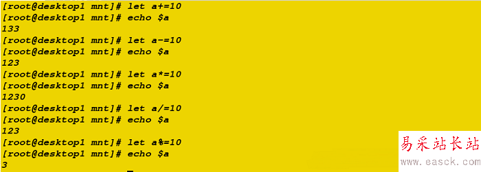 let a+=10echo $alet a-=10echo $alet a*=10echo $alet a/=10echo $alet a%=10echo $a