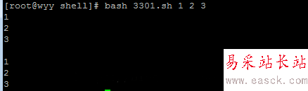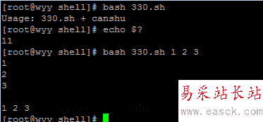 #!/bin/bashnumber=11if [ $# -eq 0 ];then echo "Usage: $0 + canshu" exit $numberfifor i in $@do echo $idoneechofor i in "$@"do echo $idone