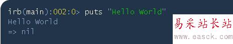 puts在Ruby中是一個簡單的打印輸出命令。后面的“=> nil”表示什么?——那是表達式的結果。Puts總是返回nil,這是Ruby中表示“絕對無值”(absolutely-positively-nothing value)的方式,看上去有些類似Java中的null。