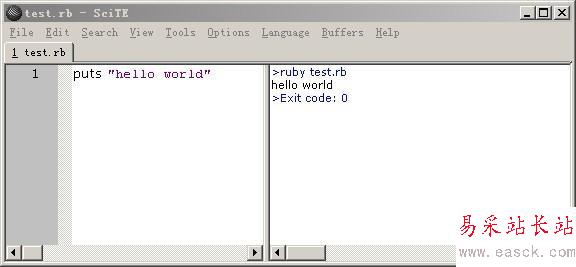 安裝SciTE后,打開它,我們輸入代碼 puts "hello world" ,點擊菜單=>file=>save 保存文件為test.rb。 然后按鍵盤F5,右側輸出窗口出現結果。如圖: