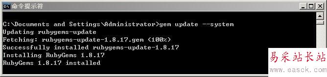 較新的Ruby版本已經包含RubyGems了,因此我們不用手動下載安裝了。只需在CMD窗口輸入指令:gem update --system ,耐心等待一段時間,已有的RubyGems會更新到目前最新的版本。如圖。