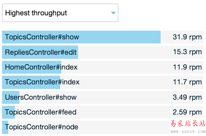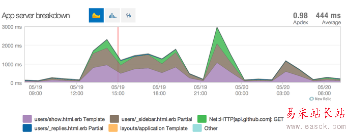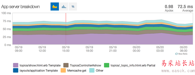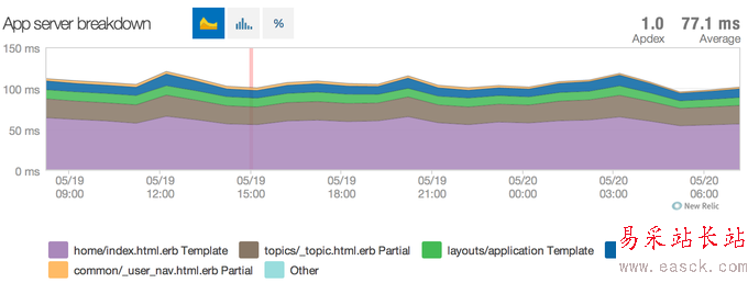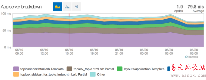 從上面的報表來看,目前 Ruby China 后端的請求,排除用戶主頁之外,響應時間都在 100ms 以內,甚至更低。