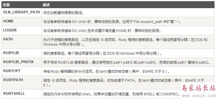 Ruby 解釋器使用下列環(huán)境變量來控制它的行為。ENV 對(duì)象包含了所有當(dāng)前設(shè)置的環(huán)境變量列表。