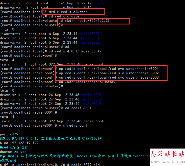創建redis-cluster目錄,再創建redis-8001,redis-8002,redis-8003節點目錄,再把redis-conf分別復制到節點目錄下