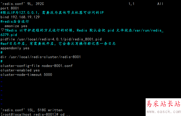 分別修改節點下redis-conf文件,由于在一臺機器(192.16819.129)上,因此每個實例應該有不同的端口;同時,每個實例顯然會有自己的存放數據的地方;開啟AOF模式;開啟集群配置;開啟后臺模式;