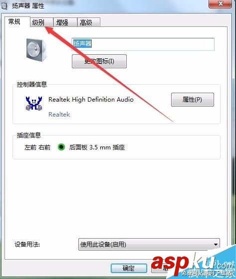 接著在打開的揚聲器屬性窗口中,點擊“級別”標簽。