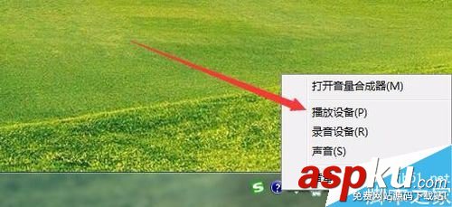 鼠標右鍵點擊音量圖標,然后在彈出的菜單中選擇“播放設備”菜單項。