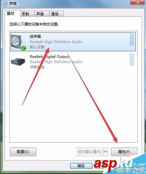 這時可以打開聲音的窗口,在這里點擊“揚聲器”一項,然后點擊右下角的“屬性”按鈕 。